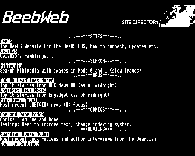 I’ve always thought the BBC Micro’s screen modes offer passable bitmap graphics, either monochrome at 640 x 256, 4 colours at 320 x 256 or “16” colours (really 8, plus 8 flashing) at 160 x 256, here is a great resource if you wanted to find out more than I could ever tell you about the BBC Micro’s graphics modes. With this is mind, I wanted to expand on my Web Browser for the BBC Micro, the issue I ran in to previously was the volume of different HTML tags that it would need to process was just too much for the little micro.